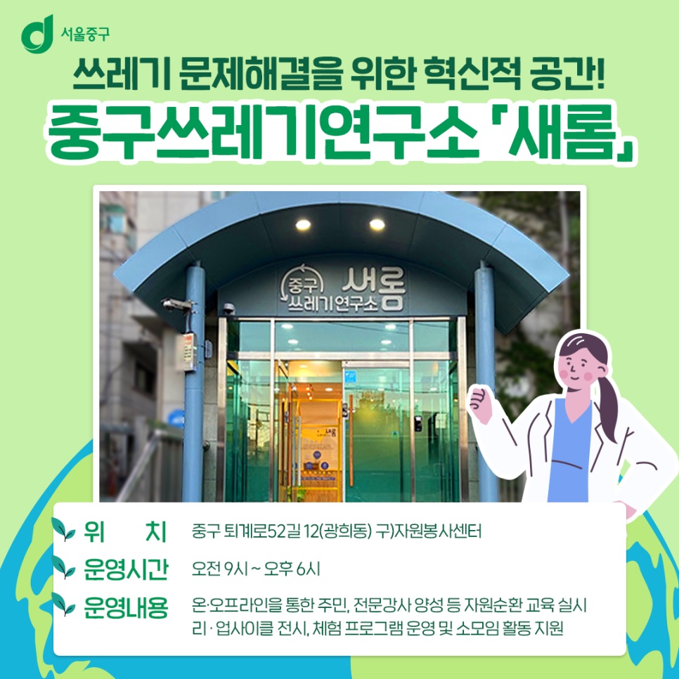 광희동(퇴계로 52길 2)에 들어서는 '새롬'은 주민을 대상으로 좋은 버림(비우기, 헹구기, 분리하기, 섞지 않기), 일상 속 친환경 습관 4R[불필요한 물건 사지 않기(Refuse), 감량(Reduce), 재사용(Reuse), 재활용(Recycle)] 실천을 위한 친환경 자원순환 교육과 각종 관련 전시, 모임을 지원하기 위해 특화된 공간이다. 종이팩, 건전지 등 고품질 재활용품 교환사업 등을 추진하기 위한 자원순환 거점 공간의 역할도 수행한다.