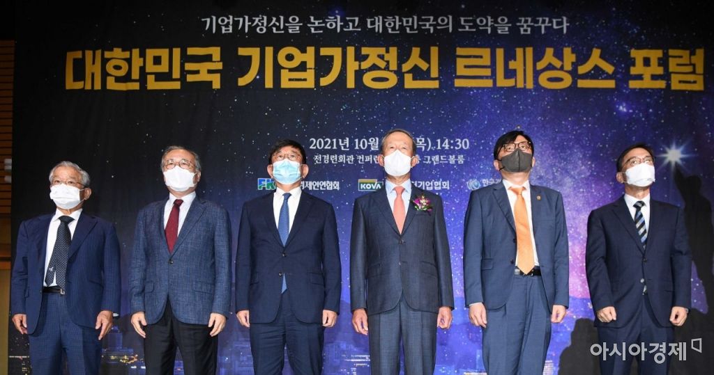 허창수(오른쪽 세 번째) 전국경제인연합회 회장을 비롯한 주요 참석자들이 14일 서울 여의도 전국경제인연합회관에서 열린 '대한민국 기업가정신 르네상스 포럼'에서 사진촬영 하고 있다./강진형 기자aymsdream@