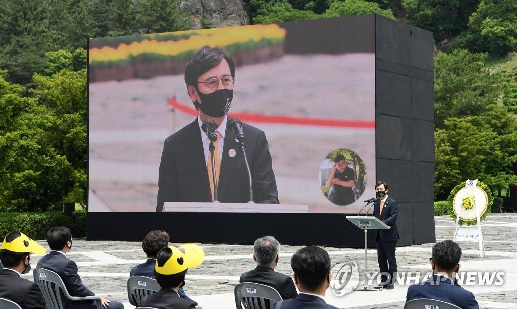 노무현재단 유시민 이사장이 5월23일 경남 김해시 진영읍 봉하마을에서 엄수된 노무현 전 대통령 서거 12주기 추도식에서 감사 인사하고 있다. [이미지출처=연합뉴스]