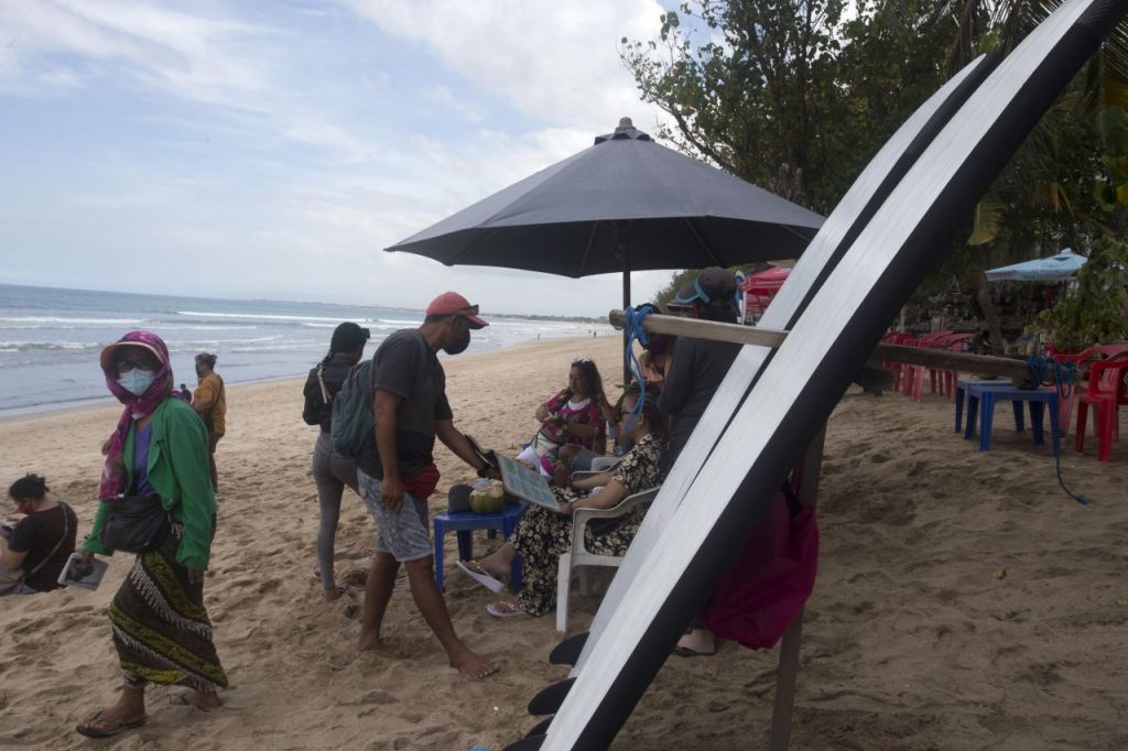 인도네시아의 유명 휴양지 발리섬의 쿠타 해변에서 14일(현지시간) 노점상들이 손님맞이 채비를 하고 있다. 인도네시아 정부는 신종 코로나바이러스 감염증(코로나19) 확산 방지를 위해 폐쇄한 지 1년여 만인 이날부터 한국을 비롯한 18개국의 백신접종 완료 외국인 관광객에게 발리, 빈탄, 바탐섬 등 휴양지를 개방하기로 했다. 사진 = AP/연합뉴스