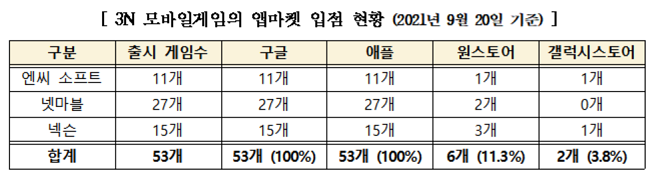 최근 김영식 국민의 힘 의원이 앱마켓 게임 콘텐츠 입점 현황을 조사한 결과 국내 3대 게임사인 엔씨소프트·넷마블·넥슨(3N)이 출시한 모바일게임 53종 중 국내 앱마켓에 입점한 게임은 7종인 13%에 불과했다. 반면 3N은 구글 플레이스토어와 애플 앱스토어에는 53종 모두 입점시켰다. 국내 대표 게임사인 3N부터 게임 대부분을 국내 앱마켓에 입점하지 않으면서 정작 국내 이용자들이 해외 앱마켓만 이용해야 하는 상황인 셈이다.