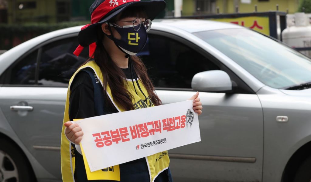 지난 6월 전국민주노동조합총연맹 공공운수노조 국민건강보험 고객센터지부 소속 조합원이 서울 마포대로 공덕에서 충정로 쪽으로 공공부문 비정규직의 직접고용을 촉구하는 손피켓을 들고 거리행진을 벌이고 있다. [이미지출처=연합뉴스]