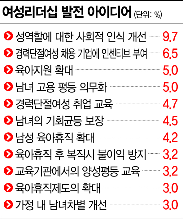 여성 리더십이 발전할 수 있는 아이디어를 제시해달라는 질문에는 ‘성역할에 대한 사회적 인식 개선’ 문제가 가장 시급한 해결 과제(9.7%)로 꼽혔다. 이어 경력단절여성 채용 기업에 인센티브 부여(6.5%), 육아지원 확대(5.0%)와 남녀고용 평등 의무화(5.0%)도 주요 과제로 인식됐다. 특히 경력단절여성 채용 기업에 대한 인센티브 부여는 연령이 낮아질수록 높은 응답을 보였다.