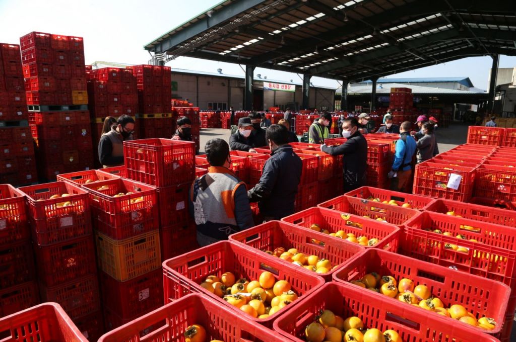 떫은 감 공판장과 수매장은 감이 가득 찬 공판용 상자와 수매 차례를 기다리는 차량이 꼬리를 잇고 있다.