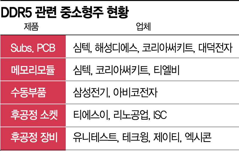심원용 신한금융투자 연구원은 "신제품 출시에 따른 패러다임 변화의 최대 수혜는 국내 후공정 장비 및 소모품 업체이며, 특히 후공정에서는 DDR5 전환시 데이터 전송 속도 및 동작 전압 변경으로 공정(Recipe) 및 장비·부품에 큰 변화가 생길 수 있다"면서 "DDR5 전환시 관련 업체의 실적 개선 폭이 2022년 상반기를 기점으로 우상향할 가능성이 크다"고 강조했다.