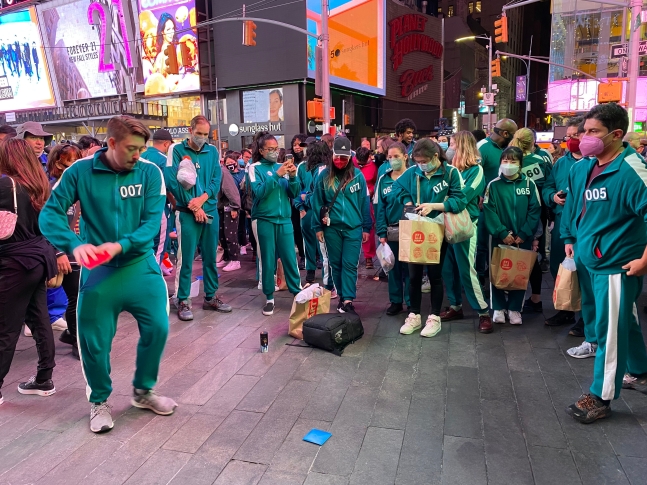 한국관광공사 뉴욕지사는 26일(현지시간) 미국인 80명을 대상으로 뉴욕시 맨해튼에서 '오징어 게임과 함께하는 뉴욕 속 한국여행(2021 Korea Tour with Squid Games in NY)'을 진행했다.