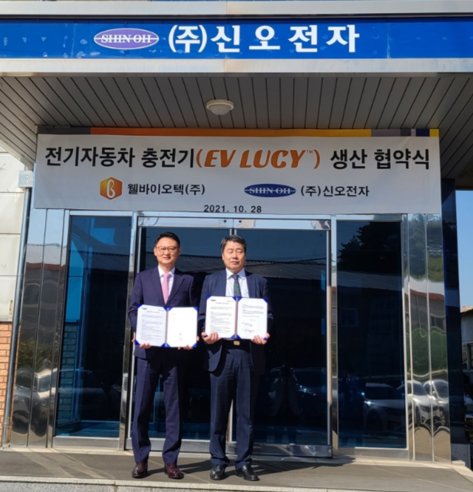 웰바이오텍은 한국형 EV충전기 제품 명칭을 ‘EV LUCY’로 확정하고 본격적인 제품 생산을 위해 신오전자와 ‘EV LUCY’ 생산 협력 계약을 체결했다고 29일 밝혔다.