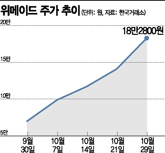 이번 달 증시가 지지부진한 흐름을 보이는 가운데 위메이드는 두드러지는 주가 강세를 나타냈다. 이달 들어 161% 이상 상승했다. 지난달 말 7만원대였던 주가는 18만원을 돌파해 장중 19만원까지 터치했다. 연초 대비로는 379%나 올랐다. 시가총액은 지난 9월 초 사상 처음으로 2조원을 넘어선 데 이어 지난달 말에는 6조원을 돌파했다. 이달 초 40위에 머물렀던 위메이드는 시총 순위도 5위로 껑충 뛰어올랐다.