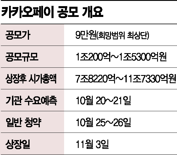 기관 수요예측과 일반 청약에서 좋은 성적을 냈지만, 증권사들은 전망은 엇갈린다. 카카오페이 시가총액은 공모가 기준 11조7330억원으로 따상이 되면 30조5059억원이 된다. 성공할 경우 형제 격인 카카오뱅크의 시총 29조9788억원(10월29일 종가 기준)보다 더 큰 규모다. 기아(34조4964억원)에 이어 코스피 시가총액 10위에 해당한다.