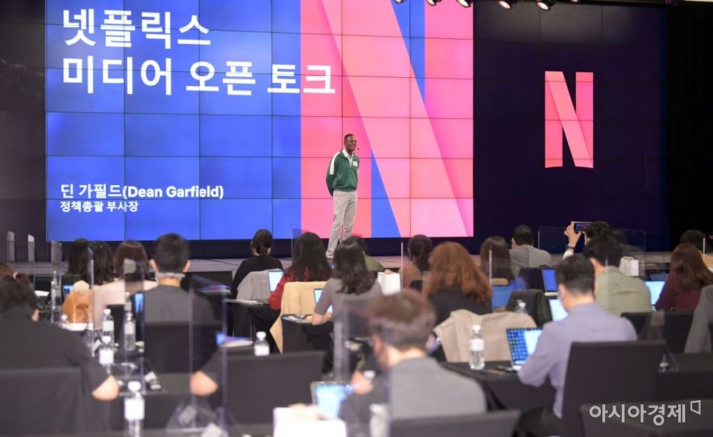 딘 가필드 넷플릭스 정책총괄 부사장이 4일 서울 종로구 JW메리어트 동대문 스퀘어 서울 호텔에서 열린 미디어 오픈 토크에서 인사말을 하고 있다./김현민 기자 kimhyun81@