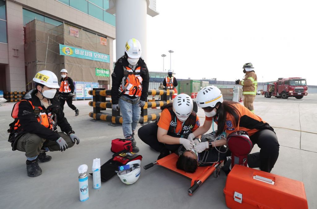 훈련은 제2여객터미널 확장사업 현장에서 용접 작업 중 화재가 발생해 근로자 화상이 발생하는 상황을 가정해 진행, ▲화재발생시 신속한 사고 신고 ▲소화기 사용 등 근로자 초동 조치 ▲2차사고 대비 현장 출입통제 및 근로자 대피 ▲소방차 화재진압 및 인명구조 등 위기대응 매뉴얼에 따라 훈련했다.
