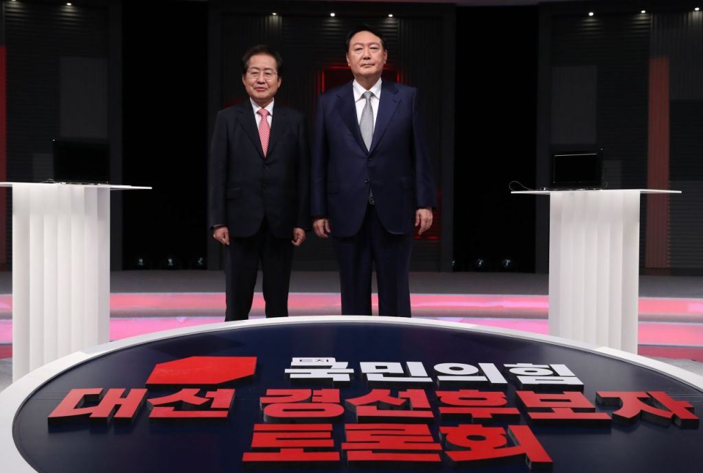국민의힘 윤석열 전 검찰총장(오른쪽)과 홍준표 의원이 지난달 15일 저녁 서울 마포구 상암동 MBC 사옥에서 열린 '1대1 맞수토론'에 앞서 포즈를 취하고 있다. (사진 제공=연합뉴스)