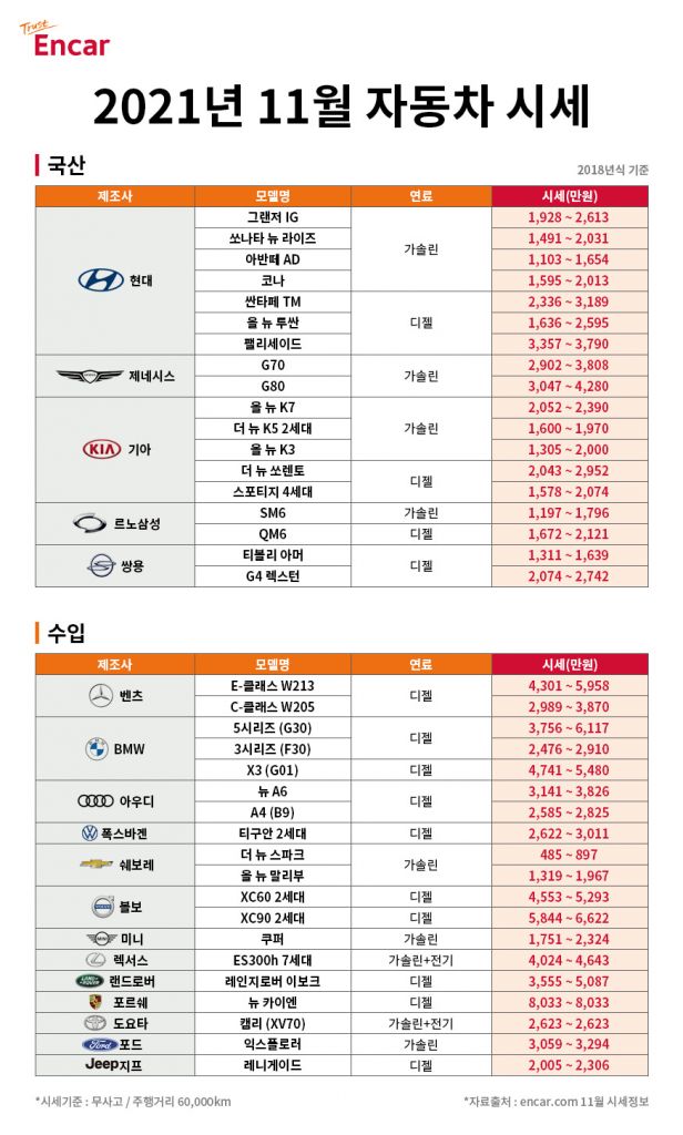엔카닷컴 관계자는 “11월부터는 코리아 세일 페스타, 연말 신차 프로모션, 연식변경 모델 출시 등으로 인해 중고차 시장 비수기에 돌입하지만 올해 11월 국산차 시세는 가격 방어가 상대적으로 잘 이뤄진 것으로 보인다”며 “수입차의 경우 국산차 대비 시세 하락폭이 큰 경향을 보이고 있어 수입차 구매를 고려하고 있는 고객은 연말 시기를 잘 이용해 보는 것을 추천한다”라고 말했다.