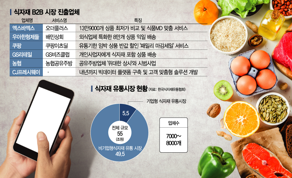 쿠팡은 입점 업체에만 식품을 납품하는 서비스를 제공하는 ‘쿠팡이츠딜’을 운영하고 있다. 쿠팡이츠는 최근 입점 업체를 대상으로 유통기한이 임박한 신선식품을 반값에 할인하는 ‘패밀리 마감세일’ 서비스를 시작했다. GS리테일은 유통전문몰 ‘GS비즈클럽’를 론칭한다. ‘GS비즈클럽’은 동네 슈퍼 등 개인 사업자에게 식자재를 포함한 상품을 배송해주는 서비스다. 농협은 공유주방 업체 ‘위대한상사’와 협업해 새로운 유통모델 시범사업을 진행하고 있다.