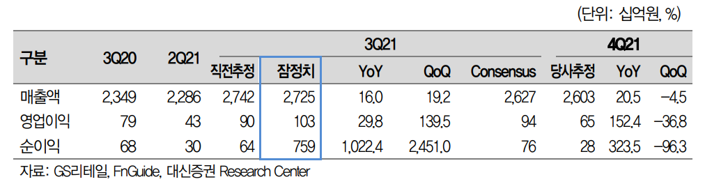 유정현 대신증권 연구원은 "3분기 홈쇼핑 연결 편입으로 영업이익이 전년 대비 30% 증가했다"며 "총매출액과 영업이익은 각각 2조7425억원, 1025억원으로 1년 전보다 16%, 30% 증가했다"고 밝혔다. 3분기부터 홈쇼핑 편입 효과로 영업이익이 증익 구간에 진입했다는 설명이다. 다만 홈쇼핑 효과를 제외할 경우 영업이익은 6% 감소했다.
