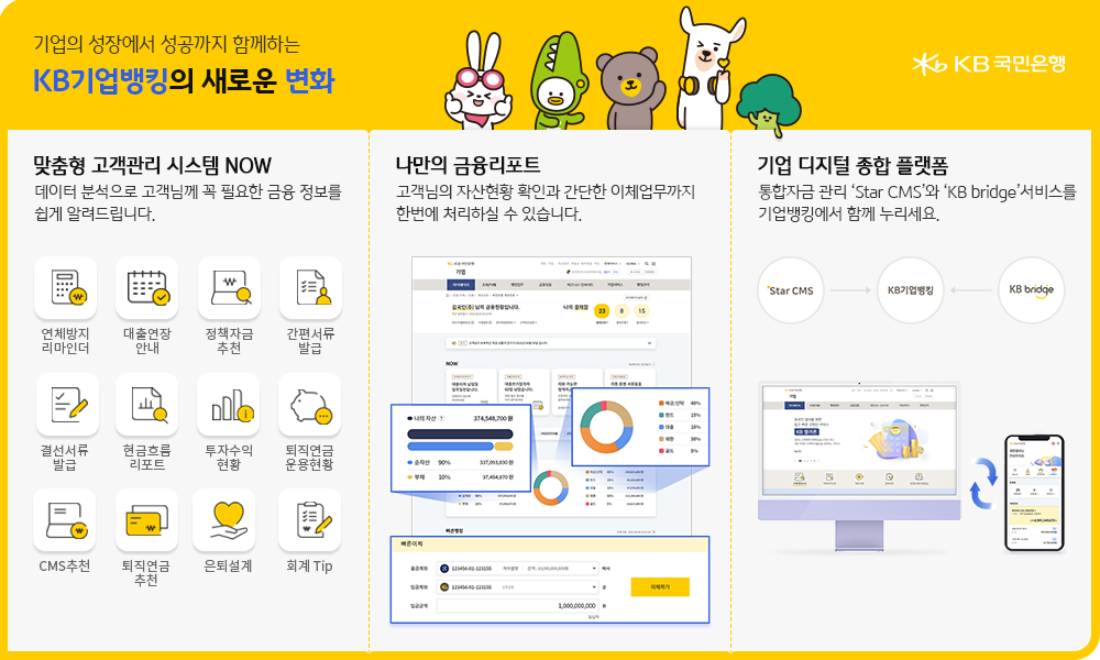 우선 별도 사이트로 운영 중이던 ‘스타(Star) CMS’를 기업인터넷뱅킹에 내재화했다. 전 금융기관 계좌조회와 집금 등 통합자금관리서비스를 기업인터넷뱅킹에서 무료로 이용할 수 있게 됐다. 또한 비금융 경영지원 솔루션 앱인 KB브릿지(bridge) 서비스를 기업인터넷뱅킹 내에 구축해 고객별 맞춤 정책자금 추천, 경영솔루션 상담 연계 등 비금융 서비스도 이용 가능하다.