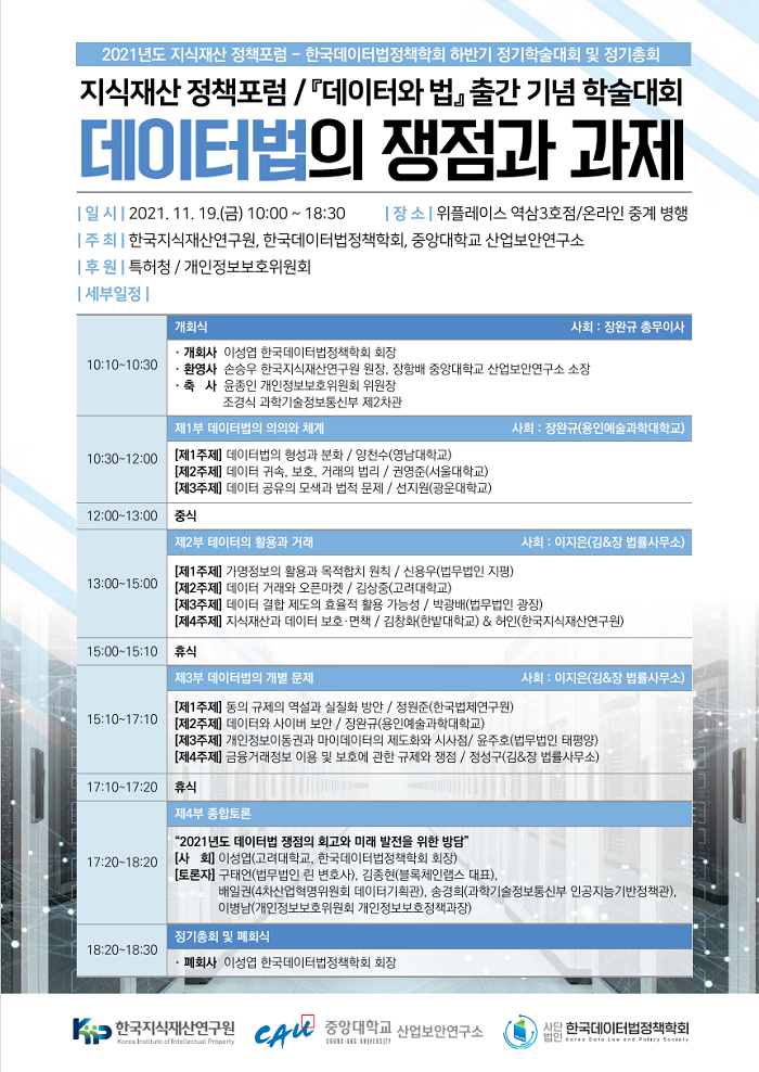 마지막 종합토론에서는 학회장인 이성엽 고려대 교수가 사회를 맡아 '2021년도 데이터법 쟁점의 회고와 미래 발전'에 대해 토론한다. 구태언 법무법인 린 변호사, 김종현 블록체인랩스 대표, 배일권 4차산업혁명위원회 데이터기획관, 송경희 과학기술정보통신부 인공지능기반정책관, 이병남 개인정보보호위원회 개인정보보호정책과장이 전문가 패널로 토론에 참여할 예정이다.