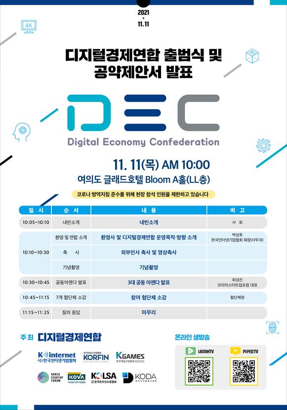 [아시아경제 조인경 기자] 디지털 경제와 산업 활성화를 위해 결정된 '디지털경제연합(DEC, Digital Economy Confederation)'이 오는 11일 공식 출범한다고 8일 밝혔다.