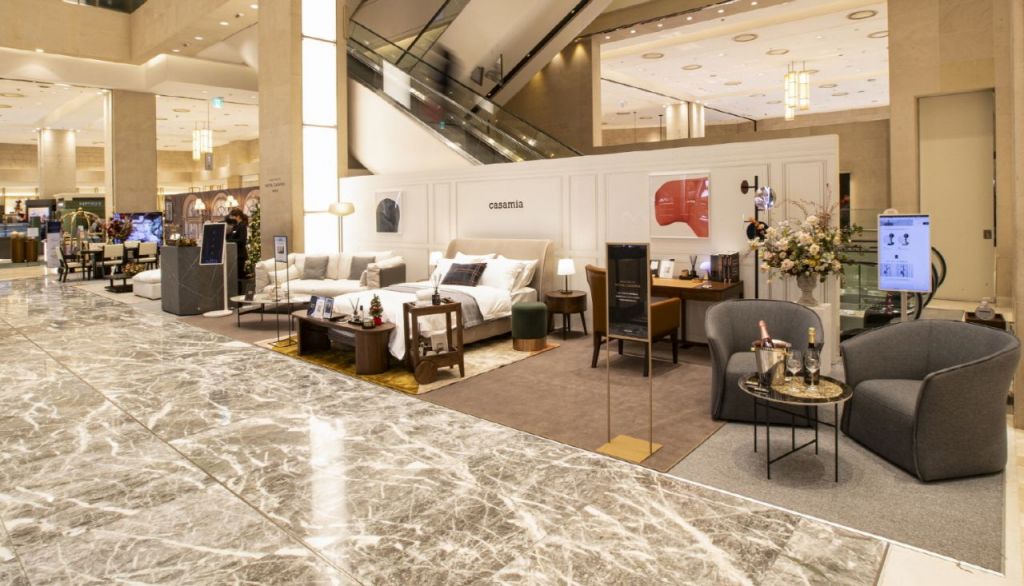 신세계백화점 본점 1층에서 진행 중인 팝업스토어는 럭셔리 호텔 라운지와 스위트룸 콘셉트로 신세계까사의 라이프스타일 공간을 제안한다. 신세계까사의 광고 캠페인을 장식한 다양한 프리미엄 가구와 베스트셀러 제품들을 활용해 인테리어를 연출했다.