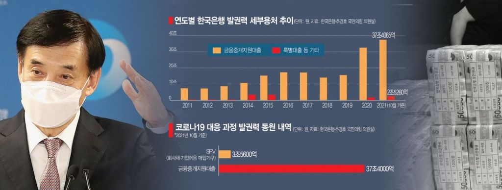 ◆전체의 90% 이상이 금융중개대출= 추경호 국민의힘 의원실이 한은으로부터 받은 자료에 따르면 올해 한은의 원화대출금(39조9325억원) 중 94%가 금융중개지원대출인 것으로 나타났다. 금융중개지원대출은 한은이 연 0.25%의 낮은 금리로 은행에 자금을 공급해 소상공인과 중소기업의 대출을 지원하는 제도다. 2018년 14조859억원이었던 금중대는 2019년과 지난해 15조5684억원, 32조5123억원으로 각각 증가했다. 한은 관계자는 "코로나19 사태가 불거지면서 규모가 크게 증가한 영향"이라며 "금융중개지원대출이 대부분을 차지한다"며 "한은법에 대출규모의 상한 등을 제한하고 있지는 않다"고 설명했다. 발권력 동원은 경제 전체에 영향을 미치는 만큼, 한은 금융통화위원회(금통위)의 결정뿐 아니라 국민 공감대가 형성돼야 한다는 것이다.