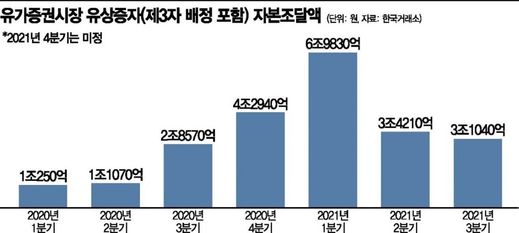 16일 한국거래소 유가증권시장본부에 따르면 올해 코스피 상장사의 유상증자를 통한 자금조달액이 1분기 6조9830억원, 2분기 3조4210억원, 3분기 3조1040억원으로 집계됐다. 3분기 유상증자를 통한 자금조달은 F&F홀딩스(1조2121억원), 흥아해운(1조1715억원) 등을 포함해 전분기와 비교하면 9% 감소했다. 그러나 이는 전년과 비교하면 의미가 다르다. 지난해 3분기 2조8570억원과 비교하면 9% 급증했다. 지난해 1분기와 2분기 역시 1조250억원, 1조1070억원으로 올해와 비교하면 현저히 적다.