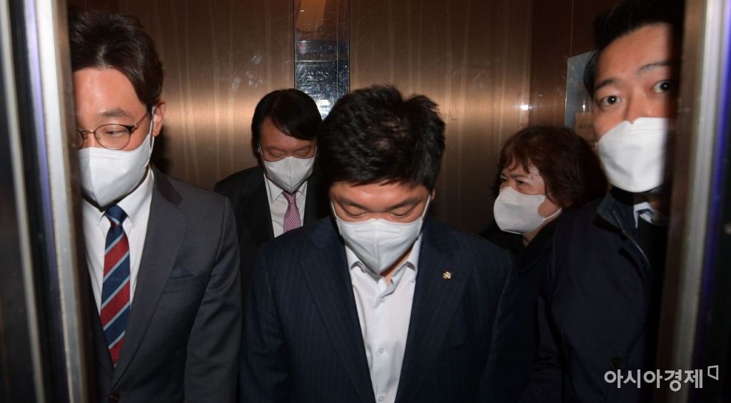 윤석열 국민의힘 대선후보가 17일 서울 여의도 당사에서 최원일 전 천안함 함장과 고(故) 이상희 하사의 부친인 이성우 유족회장을 면담하기 위해 들어서고 있다./윤동주 기자 doso7@