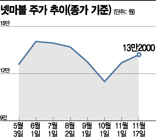 18일 한국거래소에 따르면 지난해 20만원대까지 치솟았던 넷마블 주가는 올해 14만~15만원대에서 움직이다 최근 몇달은 12만~13만원에 갇혀 있다. 우선 실적이 부진하다. 넷마블의 매출은 2020년 3분기 누계 1조8609억원에서 올해 3분기 누계 1조7546억원으로 줄었고, 영업이익은 1895억원에서 970억원으로 감소했다. 이는 신작 흥행 실패 때문이다. 넷마블의 실적을 견인했던 기존 게임들이 매출 하향세인 가운데 기대했던 신작 ‘마블퓨처레볼루션’도 8월말 출시 이후 시장 기대치에 미치지 못했다.