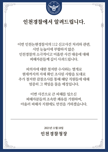 송민헌 인천경찰청장은 18일 인천경찰청 공식 홈페이지 및 사회관계망서비스(SNS) 등에 사과문을 올려 "피의자에 대한 철저한 수사와 별개로 현재까지 조사된 사항을 토대로 철저한 감찰을 진행하겠다"며 이같이 말했다.