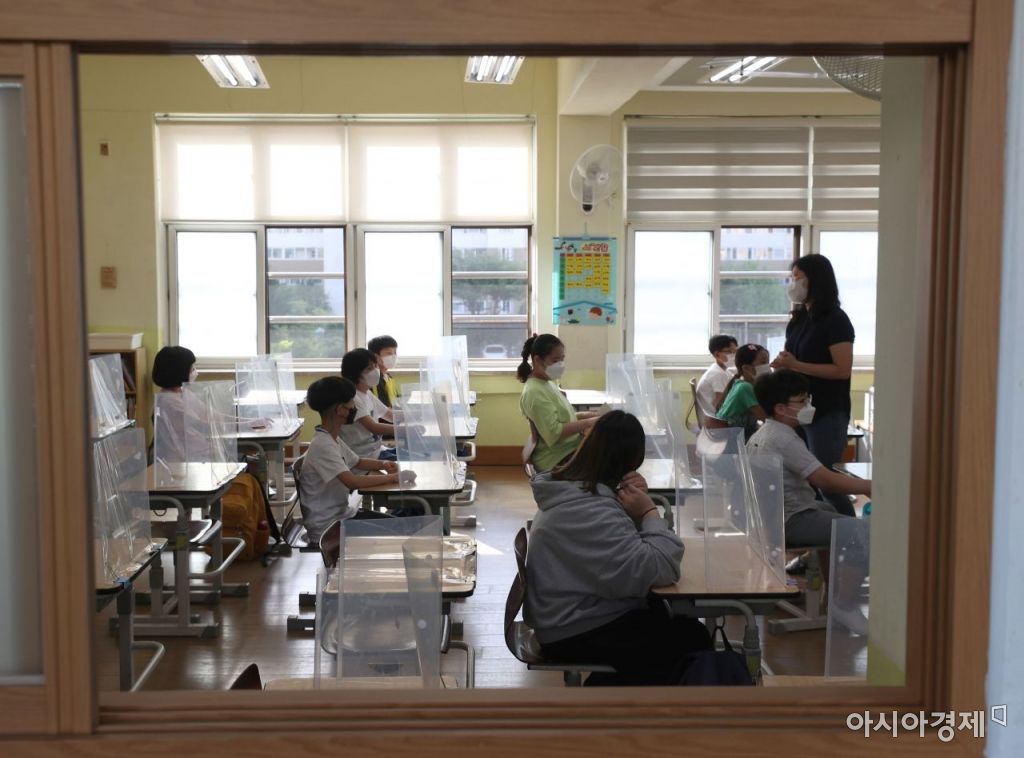전국 대부분 학교가 개학한 6일 오전 서울 강북구의 초등학교 4학년 교실에서 선생님이 수업을 진행하고 있다.