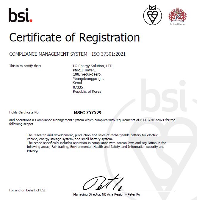 이번 인증으로 LG에너지솔루션은 글로벌 수준의 준법 경영시스템을 구축해 준법 리스크를 사전에 식별하고 예방하는 프로세스를 갖추고 있음을 인정받았다.