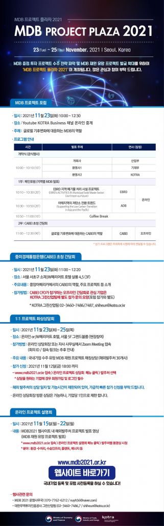 기획재정부, 산업통상자원부와 함께 진행하는 이번 행사는 글로벌 기후변화 대응을 위한 다자개발은행(MDB) 정책을 소개해 국내 기업의 대응 전략 수립을 지원하고 MDB가 추진하는 유망 프로젝트에 대한 국내 기업 수주를 확대하기 위해 추진된다.