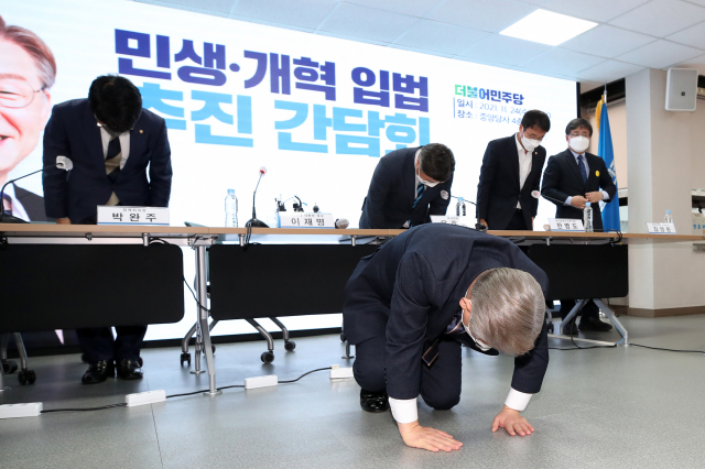 이재명 더불어민주당 대선후보가 24일 서울 여의도 중앙당사 회의실에서 열린 민생·개혁 입법 추진 간담회에서 '새로운 민주당으로 거듭나겠다'며 사죄의 절을 하고 있다. /사진=연합뉴스