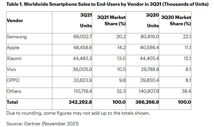 25일 시장조사기관 가트너에 따르면 올해 3분기 글로벌 스마트폰 판매량은 전년 동기 대비 6.8% 감소한 3억4229만2800대로 집계됐다. 안슐 굽타 가트너 선임 연구원은 "소비자 수요가 강력했음에도 스마트폰 판매량이 (반도체 칩 부족에 따른) 제품 출시 지연, 배송 일정 장기화, 채널 재고 부족 등으로 감소했다"고 전했다.