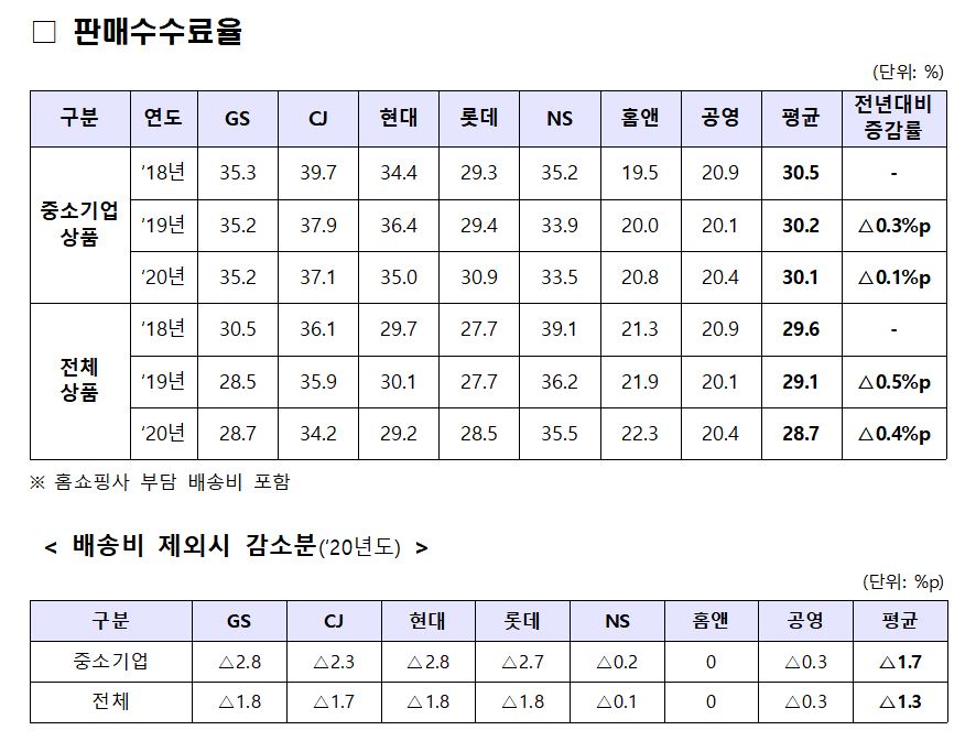 과학기술정보통신부는 2020년 TV홈쇼핑 7개사의 판매수수료율 통계를 조사한 결과 평균 판매 수수료율이 중소기업 상품 30.1%, 전체 상품 28.7%를 기록했다고 25일 밝혔다. 이는 전년 대비 각각 0.1%포인트, 0.4%포인트 인하된 수준이다. 조사 대상은 지에스리테일(GS리테일), CJ ENM, 현대홈쇼핑, 우리홈쇼핑(롯데), NS쇼핑, 홈앤쇼핑, 공영홈쇼핑 등 7개사다.