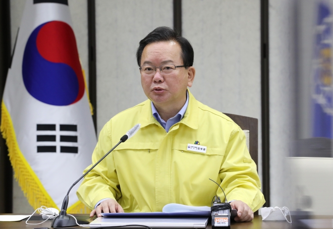 김부겸 국무총리가 24일 오전 세종시 정부세종청사에서 열린 코로나19 대응 중앙재난안전대책본부 회의를 주재하고 있다. [이미지출처=연합뉴스]
