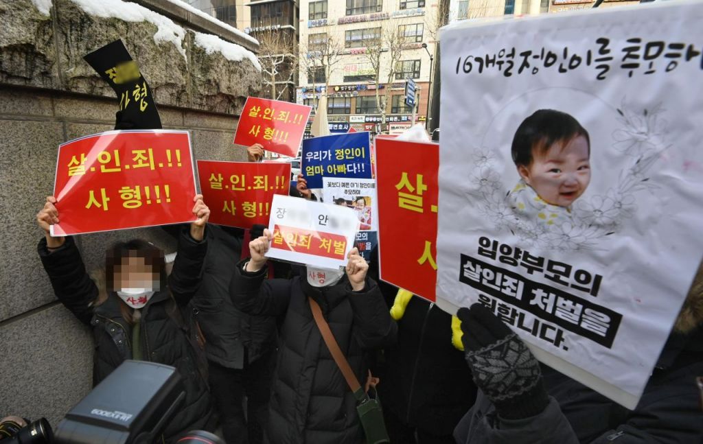 정인이 양부모의 1심 첫 재판이 열린 지난 1월13일 서울 양천구 남부지방법원 정문에서 시민들이 규탄 시위를 진행했다. /김현민 기자 kimhyun81@