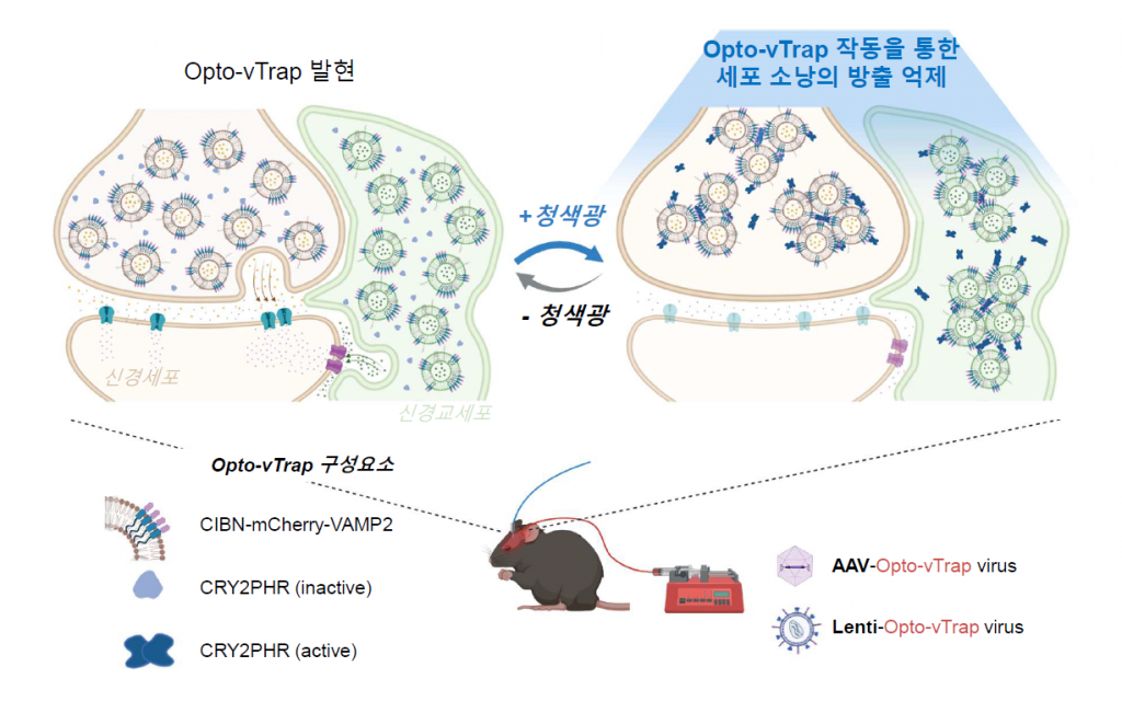 연구진은 신경전달물질 분비를 직접 조절하고자 세포에 빛을 쪼이면 순간적으로 내부에 올가미처럼 트랩을 만드는 자체 개발 원천기술을 응용, 소낭에 적용했다. Opto-vTrap을 발현하는 세포나 조직에 빛(청색광)을 가하면 소낭 내 광수용체 단백질들이 엉겨 붙으며 소낭이 트랩 안에 포획되고 신경전달물질 분비가 억제된다. 요컨대 Opto-vTrap으로 소낭의 신호전달물질 분비를 직접 제어하여 뇌 활성을 자유롭게 조절하는 것이다. 연구진은 세포와 조직실험에서 나아가 Opto-vTrap 바이러스를 이용한 동물실험을 통해 뇌세포 신호전달 뿐만 아니라 기억ㆍ감정ㆍ행동도 조절 가능함을 확인했다.