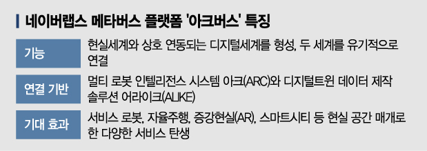 ◆‘디지털트윈’ 기반으로 현실·가상세계 연동= 석상옥 네이버랩스 대표는 1일 기자간담회(MEET UP)에서 아크버스에 대해 "독립된 가상 공간이 아닌 기술로 현실세계와 상호 연동되는 가상세계을 형성하고 두 세계를 유기적으로 연결, 사용자들에게 공간의 격차없는 동등한 경험을 제공할 수 있다는 것이 가장 큰 특징"이라고 소개했다.