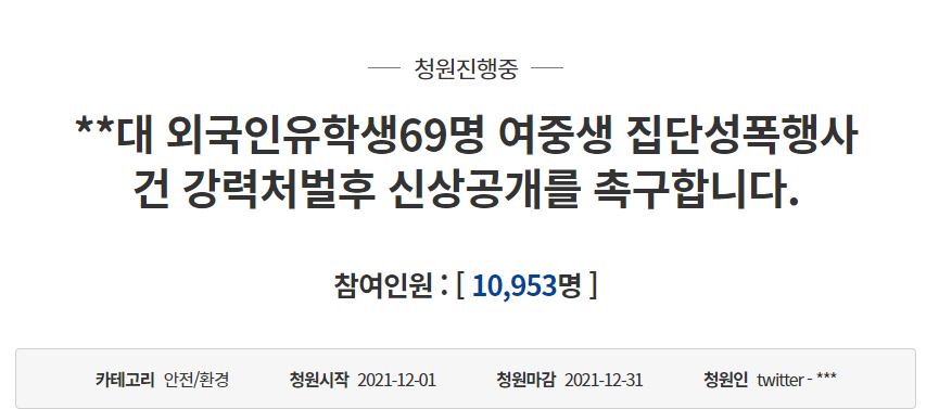 1일 청와대 국민청원 게시판에는 'XX대 외국인 유학생 69명 여중생 집단성폭행 사건 강력 처벌 후 신상 공개를 촉구합니다'라는 제목의 청원글이 올라왔다.