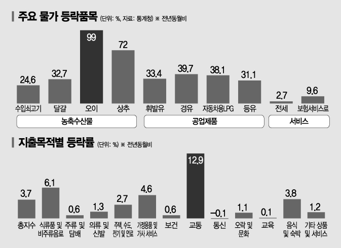 [세종=아시아경제 손선희 기자] ‘돼지고기, 달걀, 상추, 오이….’ 지난해보다 물가가 두 자릿수대로 뛴 품목들이다. 특히 오이는 1년 새 가격이 두 배 수준으로 올랐다. 평년보다 시기적으로 기온이 일찍 떨어지면서 지난달 농산물 작황부진이 밥상물가를 덮쳤다. 하반기 내내 이어지고 있는 고유가 탓에 기름값이 30% 이상 폭등했고, 전·월세 물가도 올라 서민의 시름이 깊어지고 있다. 코로나19 사태로 그렇잖아도 어려운 민생경제에 고물가까지 불을 지르는 격이다.