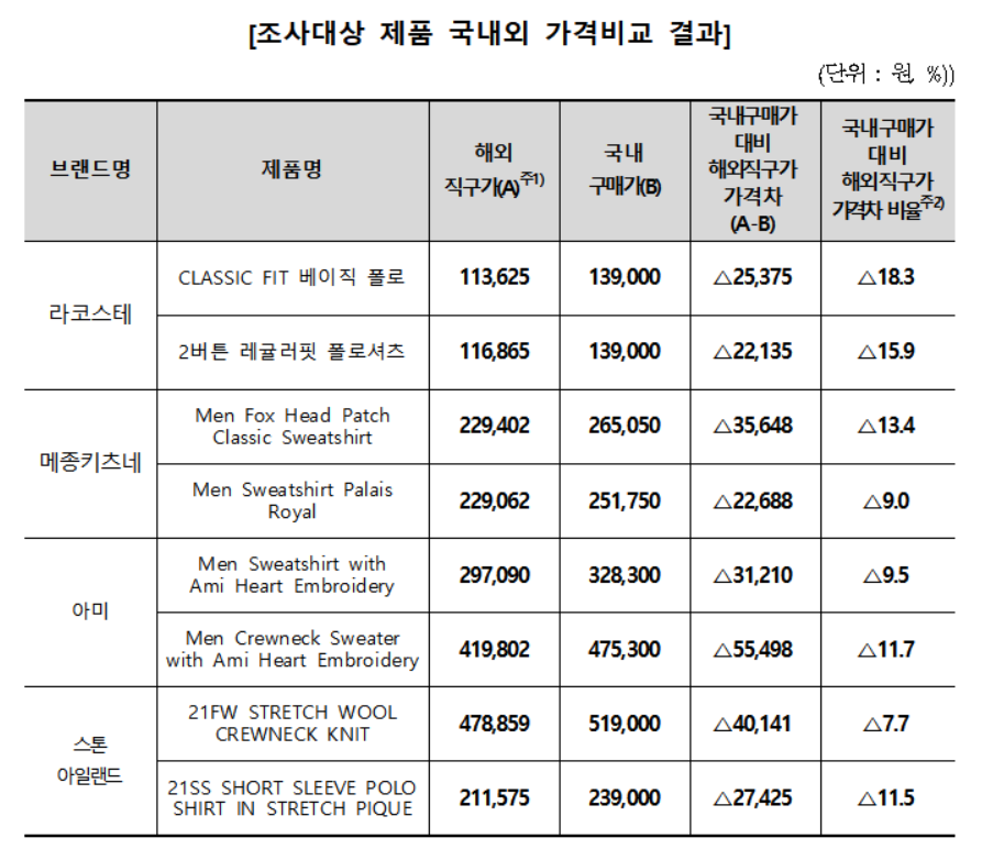 3일 한국소비자원은 라코스테, 메종키츠네, 아미, 스톤아일랜드 등 4개 브랜드의 8개 제품 가격을 조사한 결과 이같이 나타났다고 밝혔다. 소비자원은 지난 9월6일부터 10일까지 이들 제품의 국내 공식 온라인몰과 해외 쇼핑몰 판매 가격을 비교했다. 그 결과 현지 배송료와 국제배송료, 관·부가세 등을 모두 더해도 해외직구 평균 가격이 국내 구매가보다 7.7∼18.3% 저렴한 것으로 확인됐다.