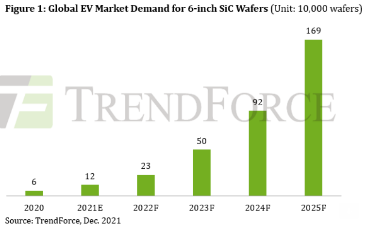 트렌드포스는 주요 자동차 제조사들이 잇따라 800볼트(V)의 고전압 전기차 충전 시스템을 도입하면서 게이트 전압을 통해 전류를 제어하는 방식인 '실리콘(Si) 절연 게이트 양극성 트랜지스터(IGBT)' 모듈이 SiC 웨이퍼를 사용한 전원 장치로 완전히 대체될 것으로 예상했다. 실제 주요 자동차 부품 공급업체들은 SiC 부품을 선호해 관련 제품들이 나오고 있다.