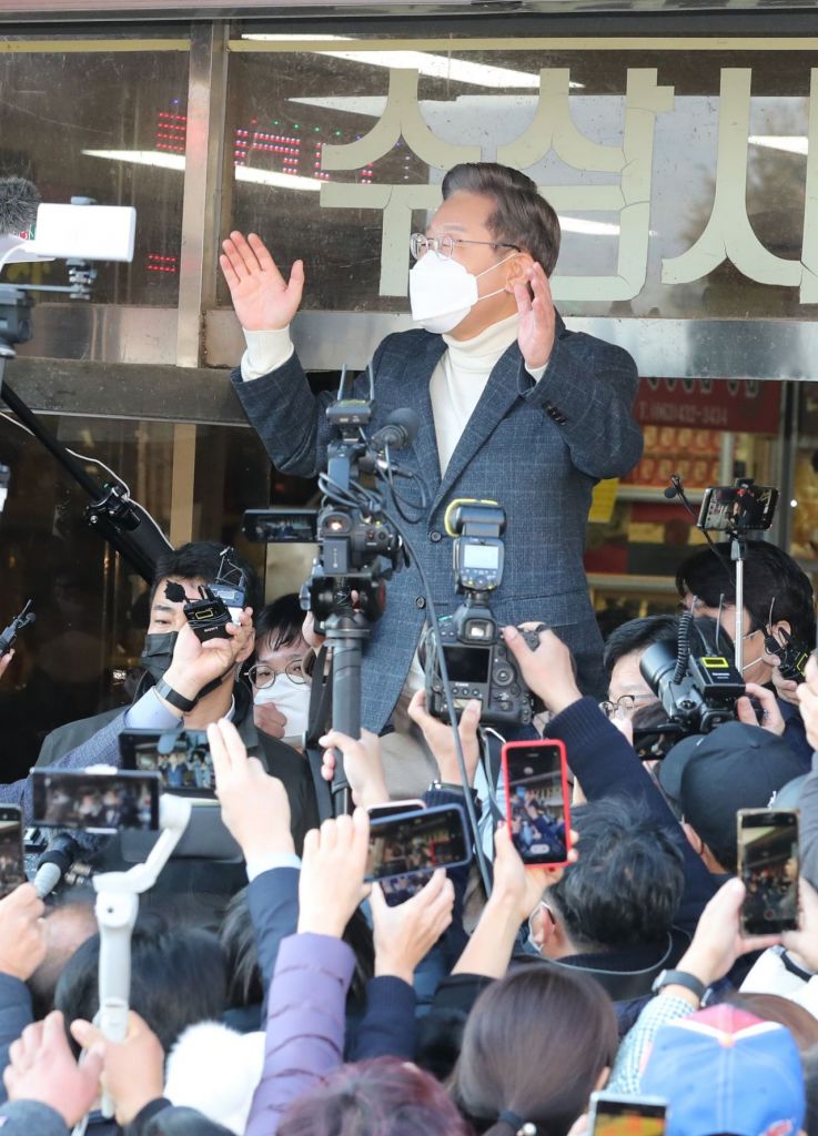 이재명 더불어민주당 대선후보가 5일 전북 진안군 인삼상설시장에서 시민들에게 지지를 호소하고 있다. [이미지출처=연합뉴스]