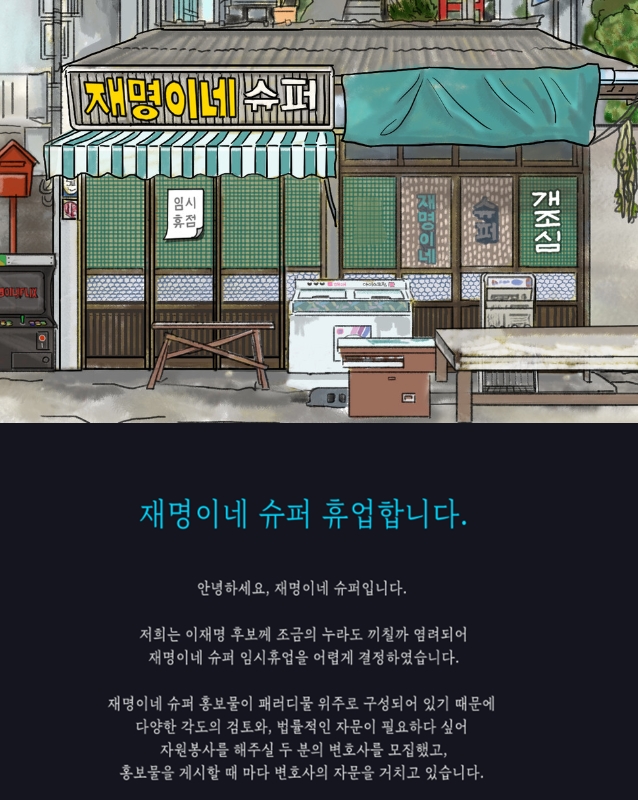재명이네는 5일 홈페이지에 공지문을 올려 "이재명 후보께 조금의 누라도 끼칠까 염려되어 임시휴업을 어렵게 결정했다"라고 밝혔다. 이들이 언급한 '임시휴업'은 콘텐츠 창작을 잠시 멈추겠다는 뜻으로 풀이된다.