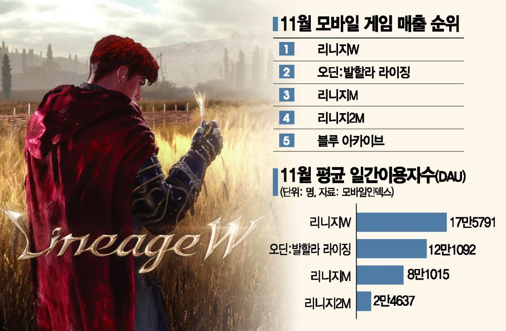 6일 모바일인덱스에 따르면 리니지W는 지난달 6일부터 구글플레이·앱스토어에서 매출 1위 자리에 올랐다. 11월 통합 월간 매출 순위에서도 리니지W가 1위를 차지했다. 2위는 카카오게임즈의 ‘오딘:발할라 라이징’이었다. 이어 3·4위는 리니지M·리니지2M이 오르면서 리니지 IP를 활용한 게임이 상위 5위권에서 비중이 60%에 달했다.