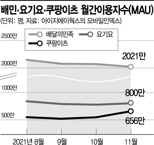 7일 데이터 기업 아이지에이웍스의 모바일인덱스에 따르면 지난달 안드로이드와 아이폰(iOS) 스마트폰 기준 배민과 요기요, 쿠팡이츠 사용자 수(MAU)는 각각 2021만 명, 801만 명, 656만 명을 기록했다. 배민은 단건배달 전면전이 본격적으로 전개된 올해 8월 2148만 명까지 사용자가 늘었지만 이후 세 달 연속 소폭 하락세를 보이고 있다. 세 달 새 126만 명의 사용자가 줄었는데 이는 6% 감소세를 보인 것이다.