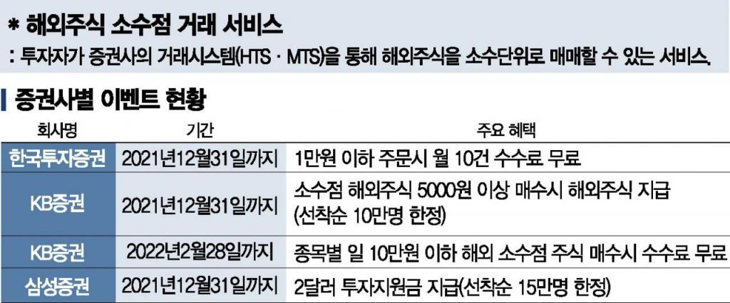 증권사들은 해외주식 소액 투자자를 신규 유치하기 위해 투자지원금 지급, 수수료 무료 혜택 등을 내건 각종 이벤트에 열심이다. KB증권은 오는 31일까지 해외 소수점 주식을 5000원 이상 매수한 개인투자자 선착순 10만명에게 해외 소수점 주식 1종목(최소 5000원부터 최대 100만원)을 무작위로 추첨해 증정한다. 내년 2월까지는 해외 주식을 종목별 일 10만원 이하 소수점 매수시 별도의 신청을 하지 않더라도 수수료 무료 혜택을 적용한다.