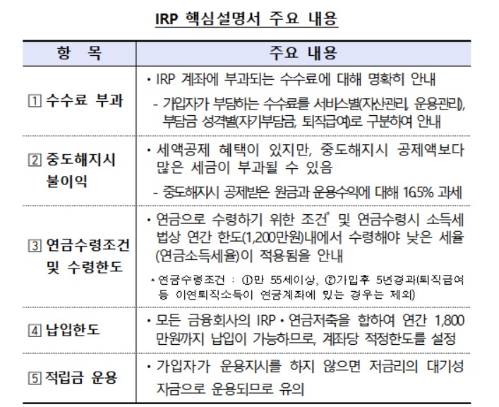 IRP 수수료는 꼼꼼히 따져보고 가입해야 한다. IRP 계좌는 퇴직한 이후 연금수령 종료시점까지 장기간 유지하게 되므로 수수료가 수익률에 미치는 영향이 크게 나타난다. 수수료가 낮은 금융회사에 IRP 계좌를 개설하는 것이 유리하므로, 계좌개설 전에 금융회사의 수수료율을 비교한 후 가입할 필요가 있다.