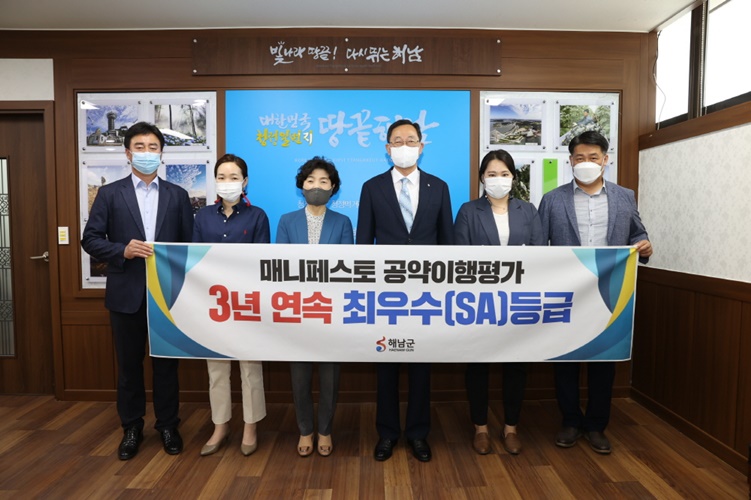 해남군은 한국매니페스토실천본부가 주관하는 공약 이행 평가 3년 연속 최우수등급(SA)으로 선정되고 2021년 공약 이행 우수 사례 발표에서 2개 지표에 대해 최우수상과 우수상을 받는 등 전국 최고의 공약 실천 지자체로 인정받고 있다.