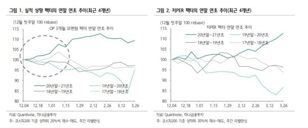 8일 하나금융투자가 최근 4년간 12월 둘째주부터 다음해 3월말까지 팩터별 수익률을 분석한 결과 12월부터 1월초까지 이익모멘텀은 34.6%으로 가장 강세를 보였다. 밸류에이션에서 저평가 종목의 경우 수익률은 20.1%, 가격이나 배당모멘텀은 마이너스 수익률을 기록했다.
